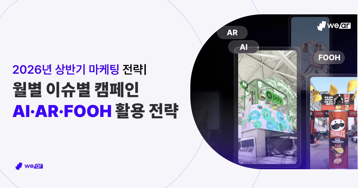 2026년 상반기 마케팅 성과는 이슈를 단순히 빠르게 따라가는 것보다, 시즌에 맞는 참여 구조를 정확히 선택했는지에 의해 좌우됩니다. FOOH, AI, AR은 목적이 아니라 월별 이슈에 맞춰 인지 → 참여 → 결과물 생성이 자연스럽게 이어질 때 성과를 내는 강력한 수단입니다. 위에이알은 2026년 상반기 주요 이슈를 기준으로 실제로 활용하기 좋은 포맷들을 정리해 드렸습니다. 월별 캠페인 방향을 고민하실 때 본 자료를 활용하시어 최적의 전략을 수립하시길 바랍니다.