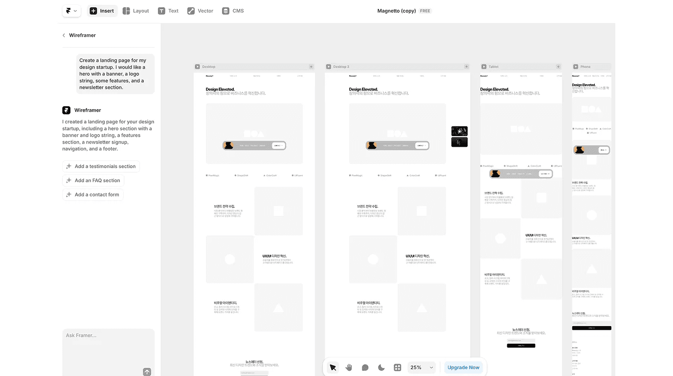 마케터를 위한 활용 가이드: Insert > Wireframer 프롬프트 창에 내용을 입력해 뼈대를 만드세요.