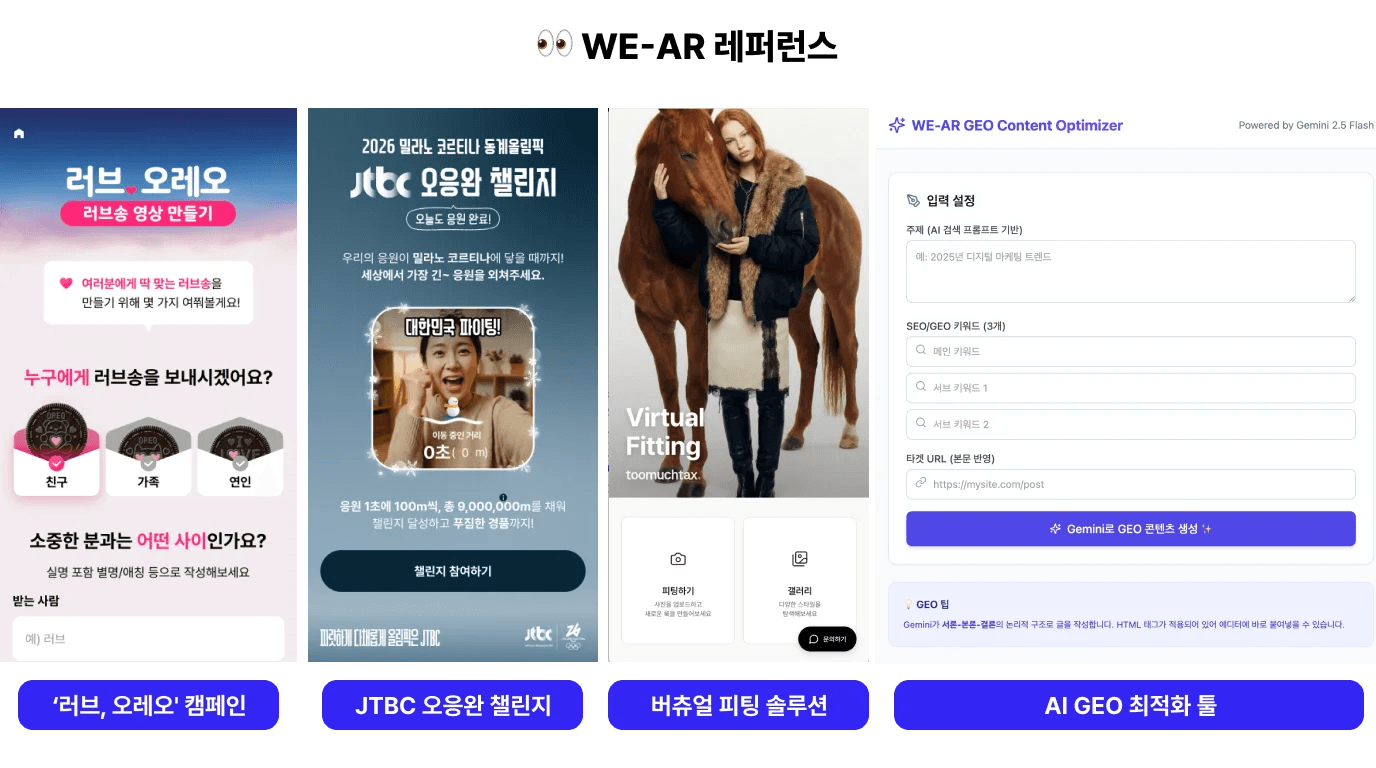 위에이알(WE-AR)은 500건 이상의 기술 기반 캠페인을 수행하며 마케터의 기획 의도를 안정적인 기술로 번역해 왔습니다.