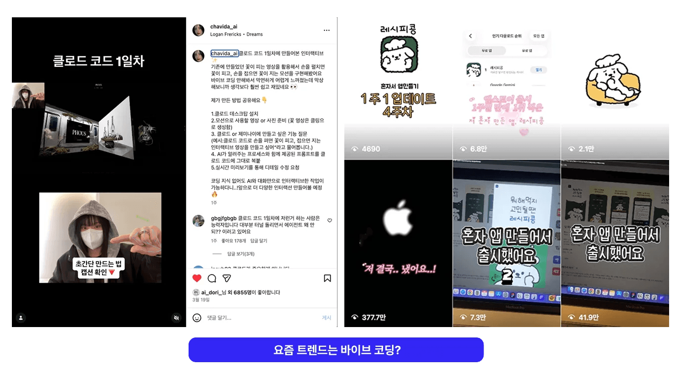성공 사례: 최근 비전공자가 챗GPT로 제작한 앱이 출시 직후 앱스토어 1위를 차지하고, 관련 릴스 조회수가 370만 회를 기록하는 등 '바이브' 중심의 창작이 주류가 되고 있습니다.