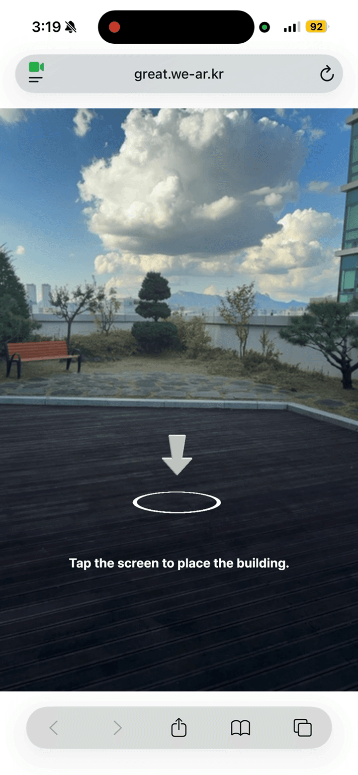 필터 실행 시 GREAT 로고가 붉은 구체 형태로 떠오르고, 바닥에는 각 건축물의 모델링과 명칭이 표시됩니다.